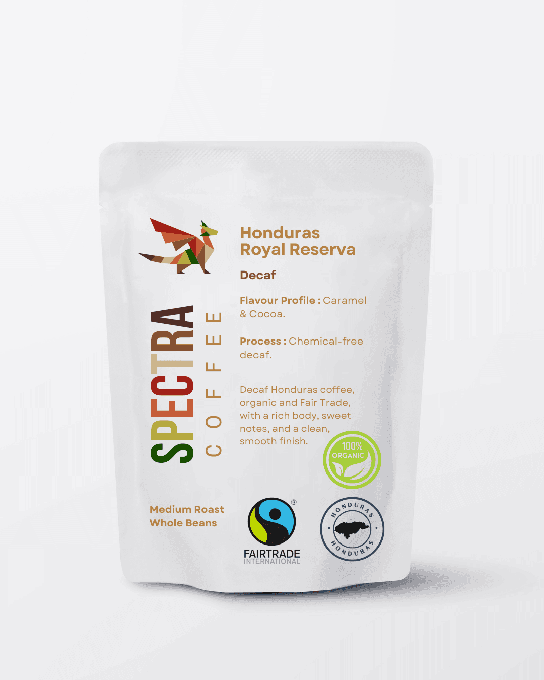 Honduras Royal Reserva Organic Fair Trade Decaf Coffee is the perfect choice for those seeking a delicious, ethically sourced decaf. This coffee is both Organic and Fair Trade certified, ensuring that it meets the highest standards of quality and sustainability. The decaf process is chemical-free, maintaining the integrity of the beans while supporting fair wages and environmentally friendly practices. Ideal for late-night brews or those sensitive to caffeine, this decaf delivers a premium coffee experience with every sip.