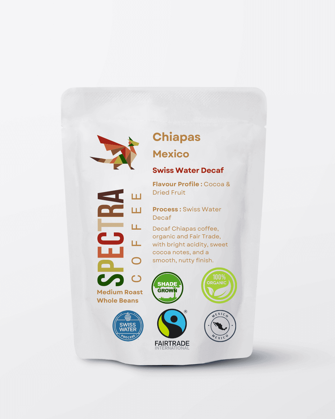 This coffee is decaffeinated using the Swiss Water Process, a chemical-free method that emphasizes sustainability. Using pure water, the caffeine is gently extracted while preserving the coffee’s natural flavors. This decaf coffee is also Organic and Fair Trade certified, ensuring that it meets high standards for both quality and ethical sourcing.